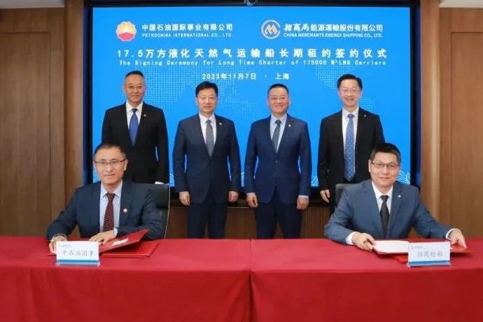 2023年11月7日,第六届中国国际进口博览会期间,招商轮船与中国石油国际事业有限公司(以下简称:中石油国事)在上海举行2艘17.5万方液化天然气运输船长期租约签约仪式。