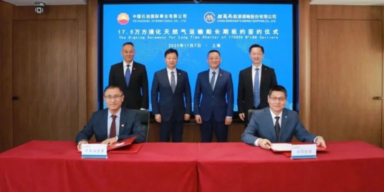 2023年11月7日,第六届中国国际进口博览会期间,招商轮船与中国石油国际事业有限公司(以下简称:中石油国事)在上海举行2艘17.5万方液化天然气运输船长期租约签约仪式。