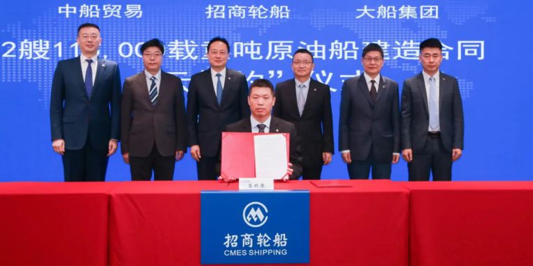 2022年6月28日,招商轮船与大船集团、中船贸易在深圳、大连、上海三地,通过“云签约”方式签署两艘11.5万吨原油船建造合同。招商轮船董事长谢春林、大船集团董事长杨志忠、中船贸易总经理胡凯出席签约仪式。