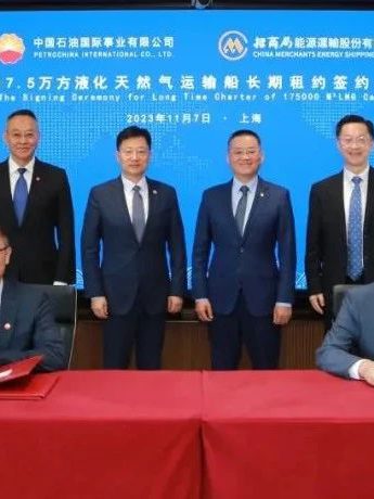 2023年11月7日,第六届中国国际进口博览会期间,招商轮船与中国石油国际事业有限公司(以下简称:中石油国事)在上海举行2艘17.5万方液化天然气运输船长期租约签约仪式。
