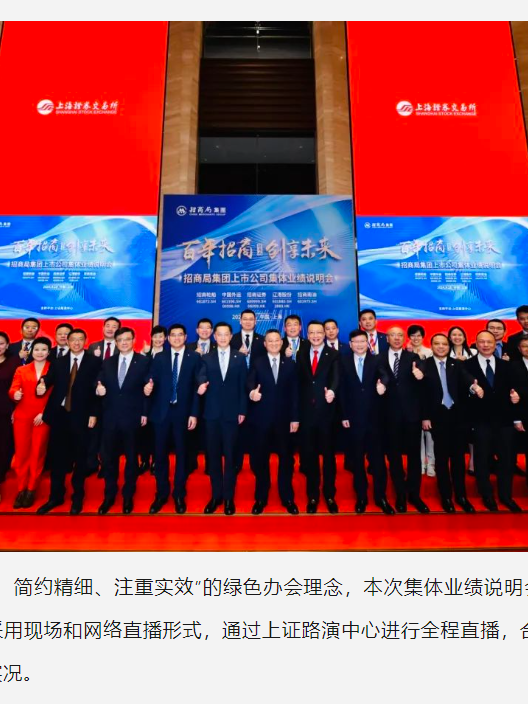 4月16日下午,招商局集团携手旗下招商轮船(601872.SH)、中国外运(601598.SH, 00598.HK)、招商证劵(600999.SH,06099.HK)、辽港股份(601880.SH,02880.HK) 和招商南油(601975.SH) 等5家上市公司,以“百年招商,创享未来”为主题,召开招商局集团沪市上市公司集体业绩说明会。
