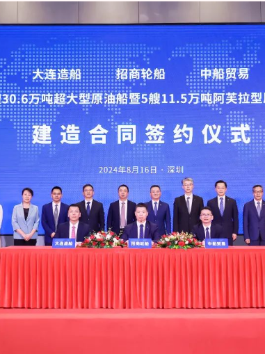 8月16日下午,招商局集团旗下招商轮船与中国船舶集团有限公司(以下简称“中国船舶集团”)旗下大连船舶重工集团公司(以下简称“大连造船”)、中国船舶工业贸易有限公司(以下简称“中船贸易”)在深圳举行5艘30.6万吨超大型原油船暨5艘11.5万吨阿芙拉型原油船建造合同签约仪式。