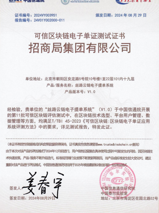 近日,在招商局集团统一组织下,由招商轮船旗下BRITC ETRADE SOLUTION COMPANY LIMITED(简称 “BRITC”)公司开发和运营的“丝路云链”电子提单系统(BRITC eBL Platform),参与并成功通过了中国信息通信研究院(简称“中国信通院”或“CAICT”)第十一批“可信区块链评估测试”,成为首个通过该测评的区块链电子单证应用系统。