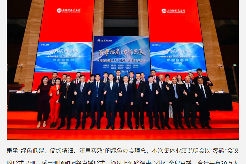 4月16日下午,招商局集团携手旗下招商轮船(601872.SH)、中国外运(601598.SH, 00598.HK)、招商证劵(600999.SH,06099.HK)、辽港股份(601880.SH,02880.HK) 和招商南油(601975.SH) 等5家上市公司,以“百年招商,创享未来”为主题,召开招商局集团沪市上市公司集体业绩说明会。