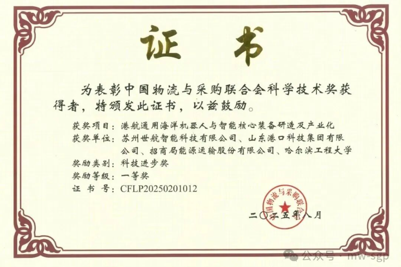 近日,中国物流与采购联合会科学技术奖评选结果揭晓,由招商轮船联合苏州世航智能科技有限公司(以下简称世航智能)、山东港口科技集团有限公司、哈尔滨工程大学共同研发的“港航通用海洋机器人与智能核心装备研造及产业化”项目,荣获科技进步一等奖,这一成果标志着我国港航智能装备领域实现关键技术突破。
