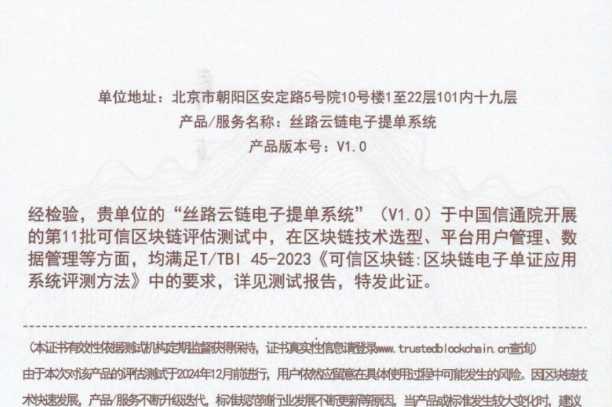近日,在招商局集团统一组织下,由招商轮船旗下BRITC ETRADE SOLUTION COMPANY LIMITED(简称 “BRITC”)公司开发和运营的“丝路云链”电子提单系统(BRITC eBL Platform),参与并成功通过了中国信息通信研究院(简称“中国信通院”或“CAICT”)第十一批“可信区块链评估测试”,成为首个通过该测评的区块链电子单证应用系统。