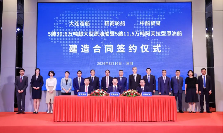 8月16日下午,招商局集团旗下招商轮船与中国船舶集团有限公司(以下简称“中国船舶集团”)旗下大连船舶重工集团公司(以下简称“大连造船”)、中国船舶工业贸易有限公司(以下简称“中船贸易”)在深圳举行5艘30.6万吨超大型原油船暨5艘11.5万吨阿芙拉型原油船建造合同签约仪式。