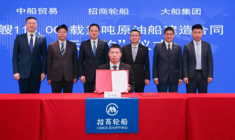 2022年6月28日,招商轮船与大船集团、中船贸易在深圳、大连、上海三地,通过“云签约”方式签署两艘11.5万吨原油船建造合同。招商轮船董事长谢春林、大船集团董事长杨志忠、中船贸易总经理胡凯出席签约仪式。