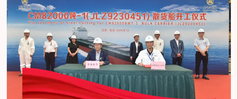 2024年8月12日,招商轮船向招商工业订造的4艘8.2万吨卡姆萨型系列散货船中的首制船“CM82000-1”开工仪式在江苏仪征举行。