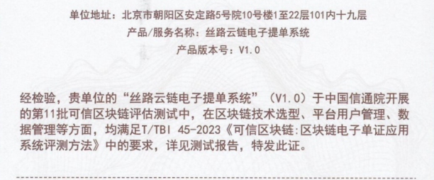 近日,在招商局集团统一组织下,由招商轮船旗下BRITC ETRADE SOLUTION COMPANY LIMITED(简称 “BRITC”)公司开发和运营的“丝路云链”电子提单系统(BRITC eBL Platform),参与并成功通过了中国信息通信研究院(简称“中国信通院”或“CAICT”)第十一批“可信区块链评估测试”,成为首个通过该测评的区块链电子单证应用系统。