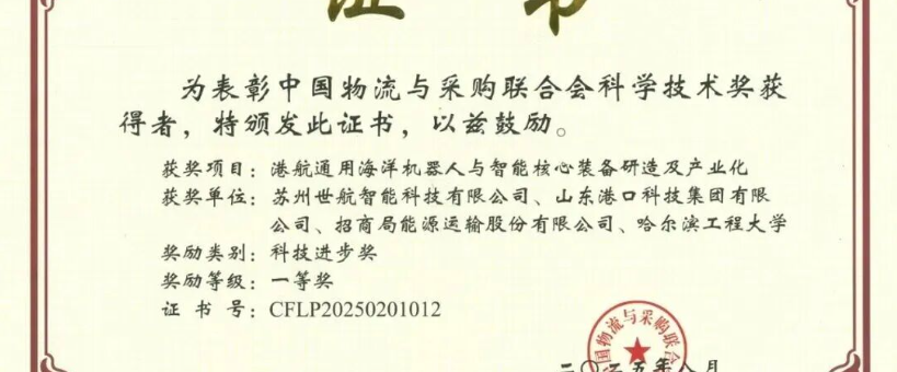 近日,中国物流与采购联合会科学技术奖评选结果揭晓,由招商轮船联合苏州世航智能科技有限公司(以下简称世航智能)、山东港口科技集团有限公司、哈尔滨工程大学共同研发的“港航通用海洋机器人与智能核心装备研造及产业化”项目,荣获科技进步一等奖,这一成果标志着我国港航智能装备领域实现关键技术突破。