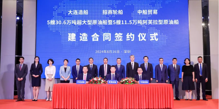 8月16日下午,招商局集团旗下招商轮船与中国船舶集团有限公司(以下简称“中国船舶集团”)旗下大连船舶重工集团公司(以下简称“大连造船”)、中国船舶工业贸易有限公司(以下简称“中船贸易”)在深圳举行5艘30.6万吨超大型原油船暨5艘11.5万吨阿芙拉型原油船建造合同签约仪式。