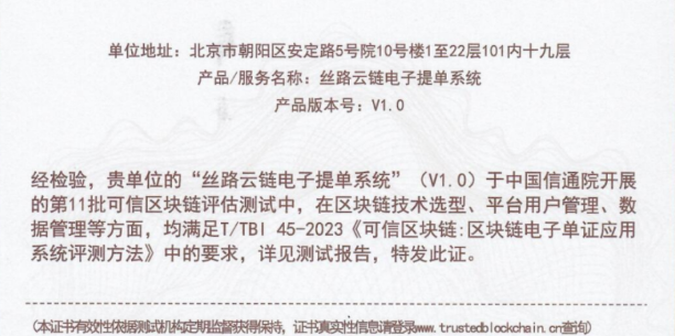 近日,在招商局集团统一组织下,由招商轮船旗下BRITC ETRADE SOLUTION COMPANY LIMITED(简称 “BRITC”)公司开发和运营的“丝路云链”电子提单系统(BRITC eBL Platform),参与并成功通过了中国信息通信研究院(简称“中国信通院”或“CAICT”)第十一批“可信区块链评估测试”,成为首个通过该测评的区块链电子单证应用系统。