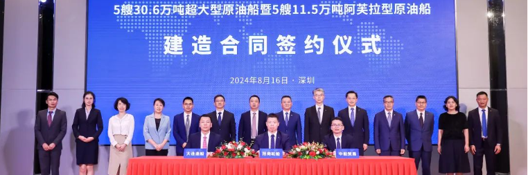 8月16日下午,招商局集团旗下招商轮船与中国船舶集团有限公司(以下简称“中国船舶集团”)旗下大连船舶重工集团公司(以下简称“大连造船”)、中国船舶工业贸易有限公司(以下简称“中船贸易”)在深圳举行5艘30.6万吨超大型原油船暨5艘11.5万吨阿芙拉型原油船建造合同签约仪式。