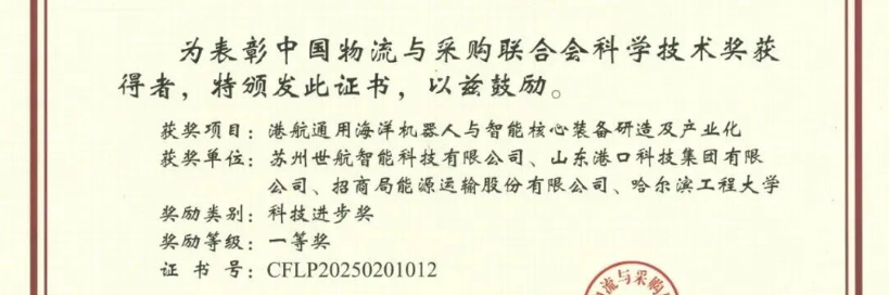 近日,中国物流与采购联合会科学技术奖评选结果揭晓,由招商轮船联合苏州世航智能科技有限公司(以下简称世航智能)、山东港口科技集团有限公司、哈尔滨工程大学共同研发的“港航通用海洋机器人与智能核心装备研造及产业化”项目,荣获科技进步一等奖,这一成果标志着我国港航智能装备领域实现关键技术突破。