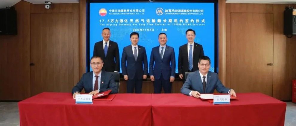 2023年11月7日,第六届中国国际进口博览会期间,招商轮船与中国石油国际事业有限公司(以下简称:中石油国事)在上海举行2艘17.5万方液化天然气运输船长期租约签约仪式。