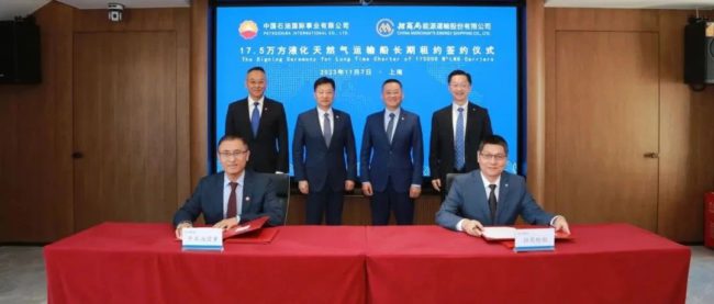 Details2023年11月7日,第六届中国国际进口博览会期间,招商轮船与中国石油国际事业有限公司(以下简称:中石油国事)在上海举行2艘17.5万方液化天然气运输船长期租约签约仪式。
